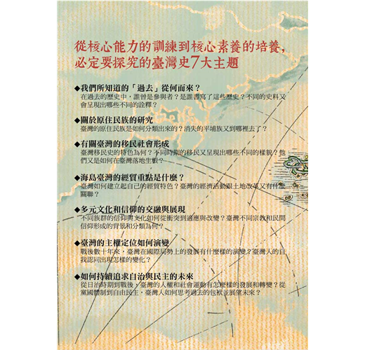 ‧強調歷史的多元視野,將臺灣史領域分為七大主題:「如何認識過去?」、「誰是原住民族?」、「移民社會的形成」、「貿易與經濟的發展」、「多元信仰與祭祀活動」、「臺澎金馬如何成為一體」、「追求自治與民主的軌跡」。