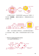 另外,針對「動詞+介系詞」、「動詞+副詞」結構的「片語動詞」,例如 give up(放棄)、bring up(養育)等等,書中也說明理解這些片語的基本原則。只要把動詞和介系詞/副詞的核心概念圖解結合在一起,並且加以解釋,就能夠理解原本以為意義難以預測的片語,終結死記硬背的惡夢!