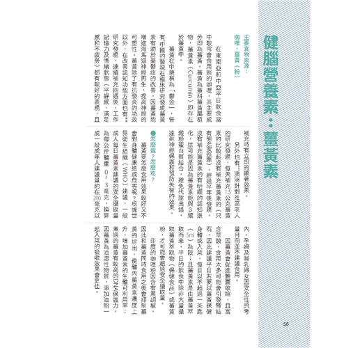 由專科營養師親自挑選適合一般人食用的食材,為大家分析每一種食材的營養素外,還為大家解說營養素對大腦的幫助。