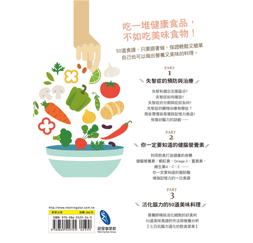 本書從失智症的成因、種類、判斷、以及藥物治療,結合營養學的知識,再藉由料理師的巧手,把一道道美味的佳餚呈現在讀者面前,讓每位讀者可以透過日常生活飲食來遠離失智症找上門,是一本非常實用的健康寶典。
