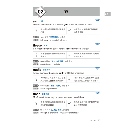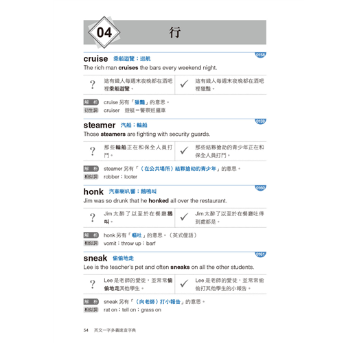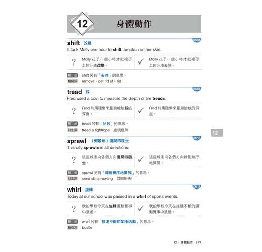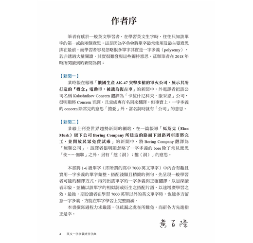 本書將1-6 級單字(即所謂的高中7000 英文單字)中內含有趣且實用一字多義的單字彙整,搭配淺顯且精簡的例句,先呈現一般學習者可能的翻譯方式,再列出該單字的一字多義與正確翻譯,以加深讀者印象,並輔以該單字的相似詞或衍生之搭配片語,以達增廣學習之效。最後,期盼讀者在學習7000 英單以外的英文單字時,也能多方留意一字多義,方能在單字學習上完整圓滿。