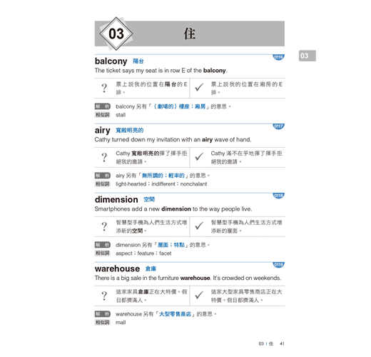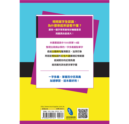 本書嚴選高中7000英單1-6級,統整出1800組高頻必學一字多義重點單字。42個主題分類輕鬆易查,每個單元透過主題例句釐清觀念、加深印象,再搭配相似詞和衍生詞擴增記憶範圍,能減輕記憶負擔,瞬間將腦袋中的模糊概念變得清晰有序,進而擴充其他更多單字量。
