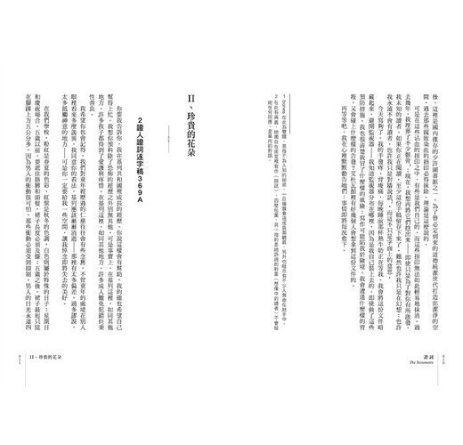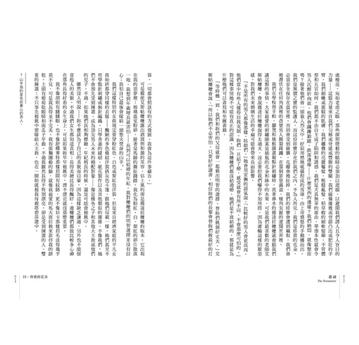 今天寫夠了。我的手發疼、背痠痛,每晚睡前那杯熱牛奶正在等我。我會將這份文件暗藏起來,避開監視器──我知道監視器分布在哪裡,因為是我自己裝上去的。即使做了這些預防措施,我也很清楚我冒了什麼樣的風險:寫作可能陷我於險境。我會遭逢什麼樣的背叛,又會碰上什麼樣的告發?艾杜瓦館裡有好幾個人會想拿到這份文件的。