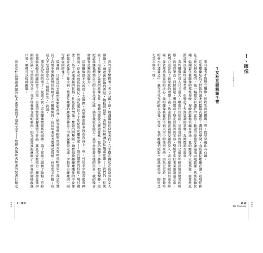 揭幕時,目前這位女雕塑家緊張萬分:她為我做的塑像是否有增色的效果?我是否贊同?我要不要露出贊同的樣子?布幔掀開時,我玩味著是否要蹙起眉梢,但想想又作罷:我這人不是沒慈悲心。「栩栩如生。」我說。