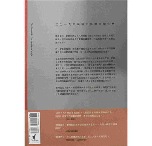 愛特伍在《證詞》裡娓娓道來這三個女人的故事,讓我們目睹基列最內部的運作狀況,成功揉合了引人入勝的懸疑、過人的機智以及建構世界的高超技巧。
