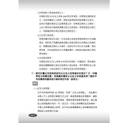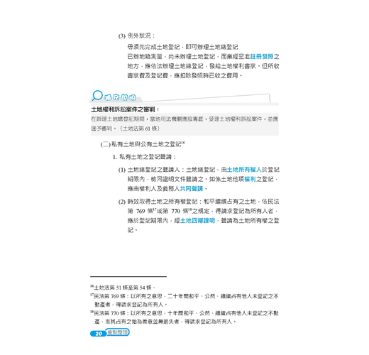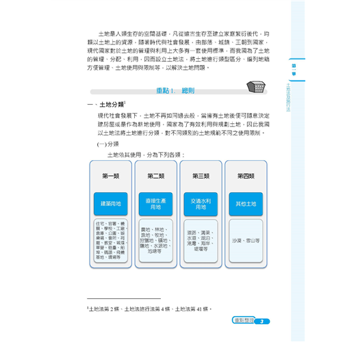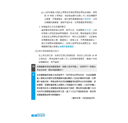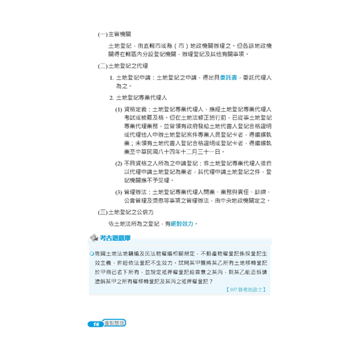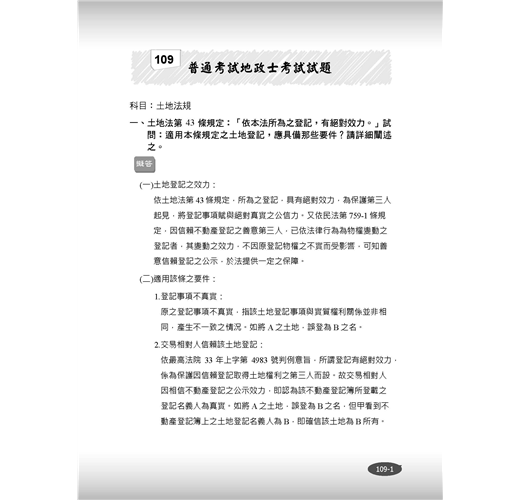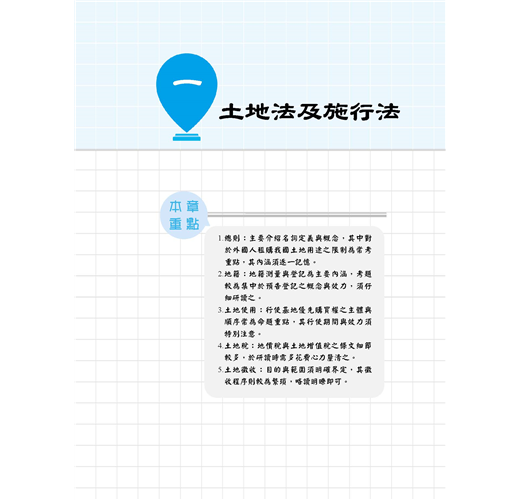 ★收錄最新95~109年地政士歷屆試題,100%題題解析!★將歷屆試題穿插於內文對應段落,凸顯重要考點!★2020年最新修正法條收錄!【常見問答】Q:本書內有包含題庫嗎?A:本書除了重點整理以外,還包含95~109年地政士試題共15份,題題詳解。Q:請問本書是最新的法規嗎?A:本書收錄至出版日前之最新法規。【本書適用】這本《土地法規》適用於專門職業及技術人員普通考試地政士考試。【考試簡介】地政士考試不限科系,只要高中(職)畢業即可報考,採及格制度沒有錄取人數限制,只要總成績達60分就合格。加上「實價登錄」實施後,地政士地位提升,收費行情約15,000~24,000元/件,月入可高達20萬元!且考試科目與不動產經紀人考科重疊性高,同時取得,業界最吃香!【本書優勢】.土地法與其他特別法重疊或牴觸時,該怎麼釐清適用順序?.閱讀書籍內文一目十行,應試時卻無法完整表達?.申論題要如何破題及清晰論述,才能獲得閱卷老師青睞?以上關於考生對《土地法規》這科產生的疑惑及困擾,三民輔考老師都知道,這本書將為您解開疑惑,消除疑慮,順利於考試時取得高分!一、簡明扼要本書深入淺出整理土地相關法規(土地法及施行法、平均地權條例及其施行細則、土地徵收條例及其施行細則、地政士法及倫理法規),去除不必要、繁雜的資訊,留下會考的、能考的及必考的重點,幫讀者釐清概念。以先土地法,後特別法,依序辨明規範重疊處,降低混淆機率,奪分關鍵盡在我手。二、掌握重點本書藉由歷年試題判斷常考重點,加以整理建立基本概念,易混淆的觀念使用表格做統整,透過互相對照,毫不費力就釐清概念。並將歷年試題穿插內文相對應位置,讓讀者掌握土地法規精要部分,一本在手,奧義盡取。再搭配本社出版的《地政士不動產實用小法典》,讀者可立即知悉被頻繁命題的考點,將記憶力花在刀口上。三、凸顯關鍵本書採雙色印刷,答題關鍵字以藍色標記,利用黑白藍三種色調,使用圖表整理繁雜內文,進行系統性學習。多一種顏色,多一道區隔,就是要使土地法規在讀者腦海中建構相關法規體系,更見清晰。四、題題詳解本書收錄95~109年普通考試地政士考試試題共15份,題題詳解。上考場作答時,最怕申論題論述雜亂無章,無法清楚表達自己腦中的解題思路。本書之申論題擬答,具層次感論述考點,教讀者如何鋪陳解題內容吸引閱卷老師青睞,做到解題思路行雲流水,不絕於卷上。【本次改版修法重點】本書收錄至出版日前之最新法規,改版修法重點包括:土地徵收條例施行細則(108.12.16)為配合實務作業需要,其修正要點如下:一、修訂申請人資格或相關事項1.申請收回土地之申請人資格。2.請求撤銷或廢止徵收之申請人資格。3.請求需用土地人徵收所有權案件之申請人資格、辦理程序及撤銷或廢止徵收情形及相關報送程序。二、規定依徵收計畫開始使用及完成使用之定義。三、定明土地徵收相關事件之損害賠償負擔原則。【三民考生上榜心得1】地政士上榜生:林家宇國文:51分民法概要與信託法概要:71分土地法規:64分土地稅法規:95分土地登記實務:72分我是非本科系考生,大學時選修不動產相關科系的課程接觸到地政士這個職業,因而在畢業後進事務所任職助理的工作。 因為在這個行業不會對助理有一輩子的職涯規劃,也想取得證照來增加客戶對我的信任,因此有非考上不可的壓力。分享各科準備方法:【民法概要與信託法概要】我認為民法不會是最難準備的一科,雖然法條多範圍廣,但綜觀歷屆地政士考試的出題方向可得知,總則/債編/物權編(混合出題2~2.5題)、親屬繼承編(完整的1題)、信託法(0.5~1題),信託法需全背,親繼範圍較少有出題方向需明確掌握,以上就有1.5題的分數了,再配合總則/債編/物權編以重點式的方向詳讀大考點的部分,其實基本分就不會太差,若此科有拿到45~50分再用其他三科cover已經足夠了。【土地法規】土地法規法條複雜,多為疊床架構式,光是一個區段徵收就在三個法條裡有不一樣的規定,可以搭配圖表的方式重點整理,再詳細列出差異點加強記憶,土地法及地政士法考點少較好把握,另外需注意土地登記規則的題目也會在本科中出現。(一)找出考點土地法:外國人禁止取得、土地法第34-1條、無人繼承處理、優先購買權。平均地權條例:照價收買、市地重劃、出租耕地收回。土地徵收條例:協議價購、徵收補償、收回權、撤銷廢止徵收。(二)善用比較法抵價地vs抵費地(給付標的、計算方式、總面積比例、稅負、強制性。)(三)名詞解釋ex市地重劃、土地徵收、區段徵收的定義,要怎麼用流暢的方式表達出來,通常可以做為破題用。(四)大法官解釋ex#579、#652、#731、#739戴老師的民法、土地法課程都會補充大法官解釋的部分,若有餘力一定要好好把握,並能理解及略記大法官解釋的內容在答題時作補充。【土地登記實務】雖然範圍較小,但沒有實務經驗較難消化一些艱澀的用字及內容,以考科來說雖然是實務,但歷屆試題大多還是著重在法條的背誦。老師上課時會補充一些實務上的例子再搭配口訣授課,在背誦的時候可以修改成自己好記憶的口訣。土登算是我花了蠻多心思的一科,雖然難背但畢竟是幾乎純背誦的科別,有花時間背通常都可以反映在分數上。【土地稅法規】土地稅法內容不多,但如果把每個稅法分開來讀,常常看了新的就忘記舊的沒辦法融會貫通,我