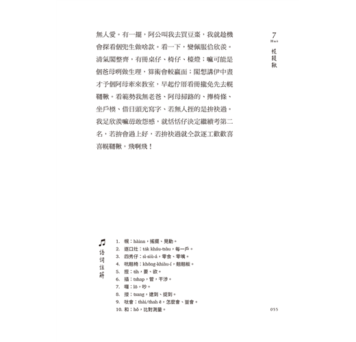 我第一擺投稿是佇阮國小校刊《瑞豐少年》創刊號,第一篇寫啥已經袂記得矣,足成是〈我的學校〉,隔冬我寫〈風鈴〉閣錄取,老師佇畢業紀念冊送我的話語內底,講我有『璀璨』的筆,叫我愛好好仔發揮。我有共伊的話記起來,嘛誠歡喜家己到今猶對文字有遮大的堅持。我十八歲彼年,共天公求保庇講「若大學考有牢,會多做功德」,毋才有法度佇外文系受正港系統化的語言佮文學訓練。畢業閣去考老師通做閣較濟功德,後來閣學輔導幫助弱勢的囡仔,學臺語拼音解救強欲失傳的臺語。我到今閣秉持信言,誠歡喜家己一直行佇做教育功德的恩典之路,嘛迷醉佇咱臺語文的媠佮趣味,拍算做到我袂行、袂喘氣。