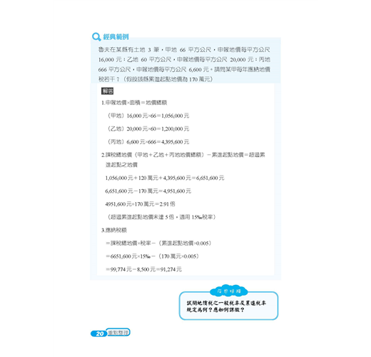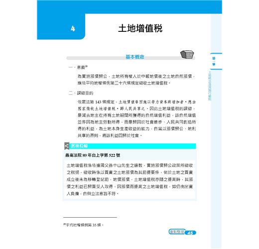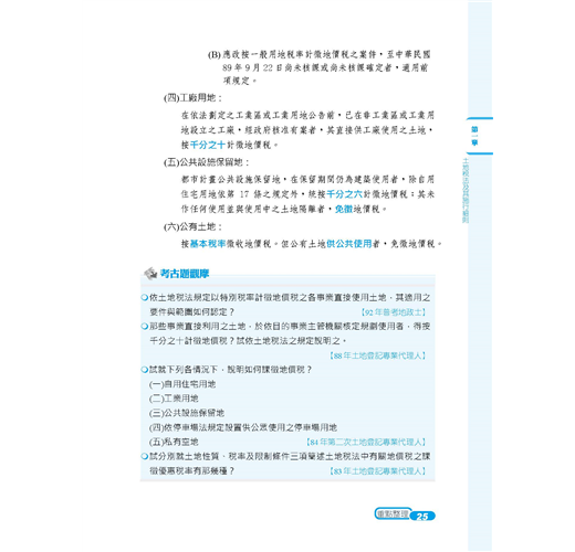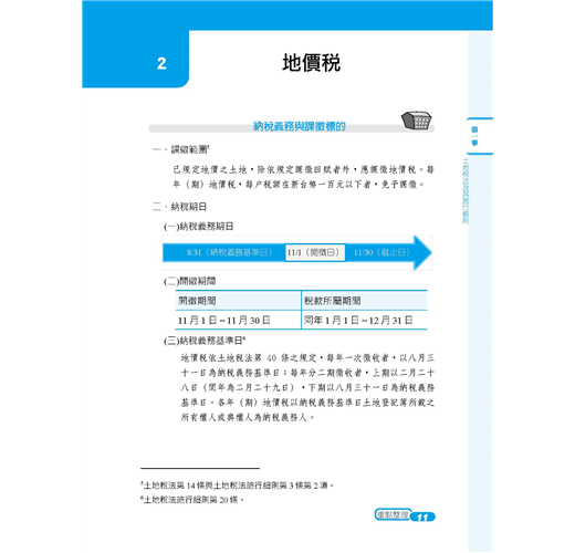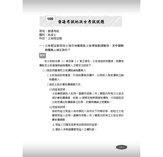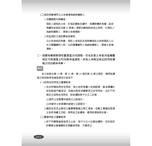 《土地稅法規》要怎麼準備?三民輔考名師林強告訴您,本書免費贈送準備要領及導讀影音課程。審訂者簡介三民補習班權威名師 林強以理論與實務併具的方式教學,輔以重大政策、時事趨勢與近年新增修條文來結合考試重點,有效的幫助學生吸收,確實掌握命題方式。經歷補教界專業講師約20年教學經驗。地政士事務所負責人。不動產經紀業公司負責人。★針對2021年地政士考試!★收錄最新100~109年地政士歷屆試題,100%題題解析!★將歷屆試題穿插於內文對應段落,凸顯重要考點!【常見問答】Q:本書內有包含題庫嗎?A:本書除了重點整理以外,還包含95~109年地政士試題共15份,100%題題詳解。Q:請問本書是最新的法規嗎?A:本書收錄至出版日前之最新法規。【本書適用】這本《土地稅法規》適用於專門職業及技術人員普通考試地政士考試。【考試簡介】地政士考試不限科系,只要高中(職)畢業即可報考,採及格制度沒有錄取人數限制,只要總成績達60分就合格。加上「實價登錄」實施後,地政士地位提升,收費行情每件約15,000~24,000元,月入可高達20萬元!且考試科目與不動產經紀人考科重疊性高,同時取得,業界最吃香!【本書優勢】 土地相關稅法條文太多,腦內概念含糊不清? 對各種相近的土地稅法概念感到混淆嗎? 考場作答腦內一片空白無法思考?擬答順序顛倒錯亂? 遇到計算題直接想放棄?適用何種稅率搞不清楚?以上對於土地稅法規理解不夠通透的問題,三民輔考老師都知道,這本書將帶您解決困惑,取得高分!本書試圖透過重點整理引導,輔以歷屆試題演練的方式,幫讀者排除這些應試障礙。【本書優勢】一、深入淺出本書整理相關土地稅法規(土地稅法及其施行細則、房屋稅條例、契稅條例、所得稅法財產交易新制部分、遺產及贈與稅法及其施行細則、稅捐稽徵法及其施行細則及工程受益費徵收條例),將法規內容化繁為簡,讓考生以簡馭繁;提高易讀性,在概念融會貫通下,證照唾手可得。二、條理分明各章節開頭字字珠璣地詳列學習重點,先提供讀者引路明燈,心中先有大致框架,再一一梳理法規脈絡,完整擊破學習盲點,緊扣命題大綱進行章節安排。以精緻圖表輔助學習,釐清相似或易混淆概念,並結合實務,讓讀者在法規研讀及實務操作之間靈活運用。三、齊全完備作者精研81~94年地政士土地稅法規考古題,將考點相同的題目分列於書中內文相對應之段落,協助考生更具體的理解各主題過往命題焦點。每章節後面,備有相對應之歷屆試題,便於考生檢視自我學習成效,從中釐清命題動態。書末幫考生貼心準備95~109年地政士土地稅法規考古題,由三民輔考名師精心審訂,題題詳解,讓答題井然有序、層次分明。理論概念與計算題型兼顧,完美擬答一揮而就,伴讀者克服申論題恐懼! 四、重點凸顯本書採雙色印刷,答題關鍵字以藍色標記,利用黑白藍三種色調,進行系統性學習。多一種顏色,多一道區隔,就是要使複雜的土地稅法規,在讀者腦海中更見清晰。【準備要領】「土地稅法規」一科的相關法規範圍較廣,而觀察歷屆試題出題趨勢,考生務必熟讀「土地稅法及其施行細則」、「房屋稅條例」、「契稅條例」、「遺產及贈與稅法及其施行細則」與「稅捐稽徵法及其施行細則」之相關規定,另要建立稅務基本架構如下:一、意義及功能:了解個別稅法立法的目的與法條規定的主要意旨。二、課徵範圍:針對課稅客體歸納。三、納稅義務人:針對課稅主體歸納。四、稅基:稅額計算的因子特別重要。五、稅率:一般稅率及優惠稅率。六、其他相關優惠、減免、不課徵及退稅等規定。【三民考生上榜心得1】地政士上榜生:林家宇國文:51分土地法規:64分土地稅法規:95分土地登記實務:72分民法概要與信託法概要:71分我是非本科系考生,大學時選修不動產相關科系的課程接觸到地政士這個職業,因而在畢業後進事務所任職助理的工作。因為在這個行業不會對助理有一輩子的職涯規劃,也想取得證照來增加客戶對我的信任,因此有非考上不可的壓力。分享各科準備方法:【民法概要與信託法概要】我認為民法不會是最難準備的一科,雖然法條多範圍廣,但綜觀歷屆地政士考試的出題方向可得知,總則/債編/物權編(混合出題2~2.5題)、親屬繼承編(完整的1題)、信託法(0.5~1題),信託法需全背,親繼範圍較少有出題方向需明確掌握,以上就有1.5題的分數了,再配合總則/債編/物權編以重點式的方向詳讀大考點的部分,其實基本分就不會太差,若此科有拿到45~50分再用其他三科cover已經足夠了。【土地法規】土地法規法條複雜,多為疊床架構式,光是一個區段徵收就在三個法條裡有不一樣的規定,可以搭配圖表的方式重點整理,再詳細列出差異點加強記憶,土地法及地政士法考點少較好把握,另外需注意土地登記規則的題目也會在本科中出現。(一)找出考點土地法:外國人禁止取得、土地法第34-1條、無人繼承處理、優先購買權。平均地權條例:照價收買、市地重劃、出租耕地收回。土地徵收條例:協議價購、徵收補償、收回權、撤銷廢止徵收。(二)善用比較法抵價地vs抵費地(給付標的、計算方式、總面積比例、稅負、強制性。)(三)名詞解釋ex市地重劃、土地徵收、區段徵收的定義,要怎麼用流暢的方式表達出來,通常可以做為破題用。(四)大法官解釋ex#579、#652、#731、#739戴老師的民法、土地法課程都會補充大