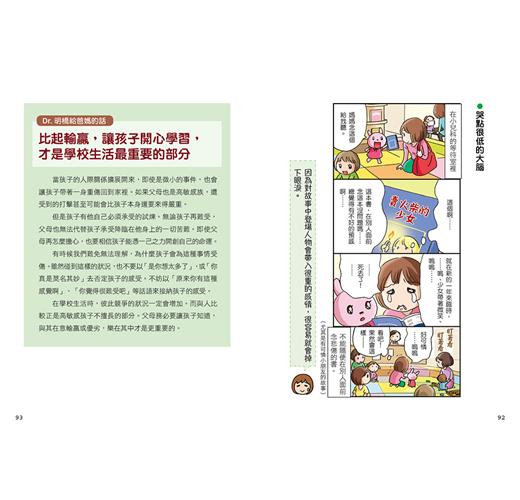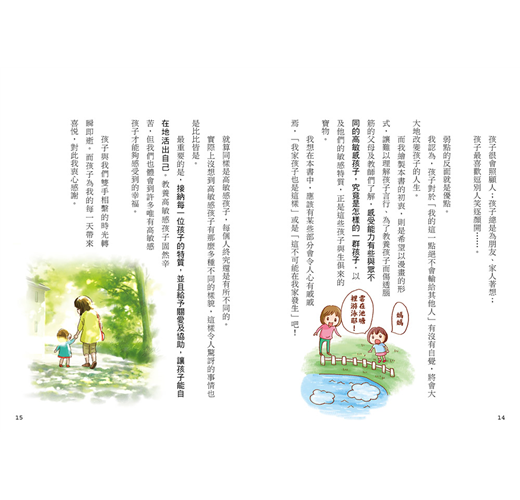 作者本身是高敏感族群的一員,孩子也具備高敏感特質,因此親子相處中,總是充滿著許多劇烈的情緒波動,作者以自身經驗說明高敏感孩子在各種親子相處時可能產生的各種心境,引導讀者同理共感,讓父母更了解身邊敏感孩子的內心世界: