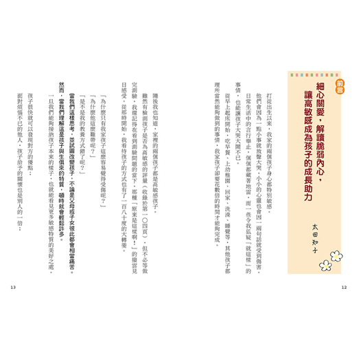 直到有一天,作者發現原來這些都是「高敏感孩子」的獨特氣質,並開始接納理解孩子與生俱來的特質,細心觀察後,從此看見更多敏感特質的美好之處。