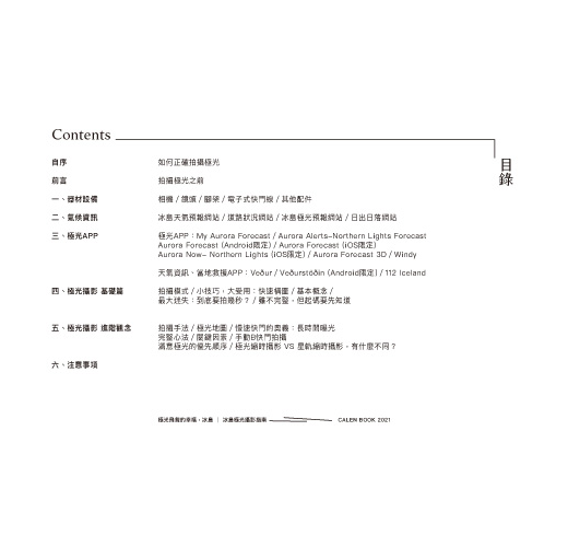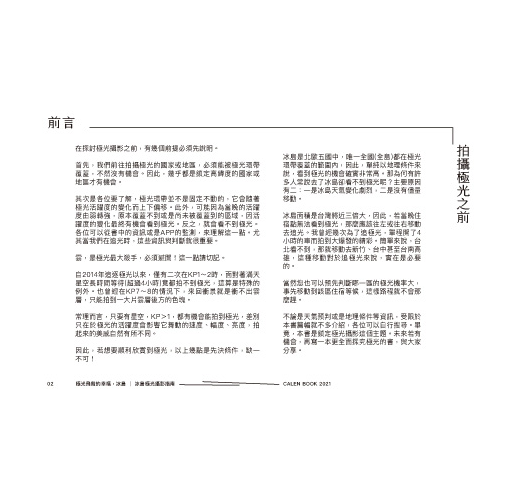不論是天氣預判或是地理條件等資訊,受限於本書篇幅就不多介紹,各位可以自行搜尋。畢竟,本書是鎖定極光攝影這個主題。未來若有機會,再寫一本更全面探究極光的書,與大家分享。