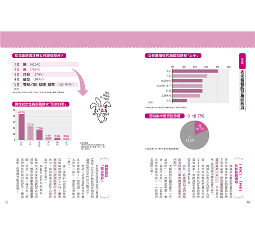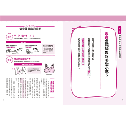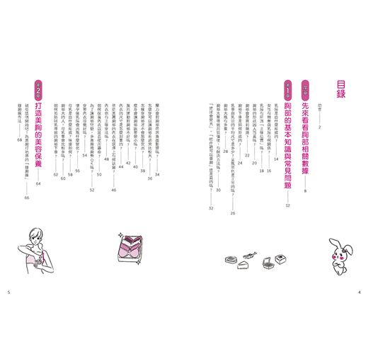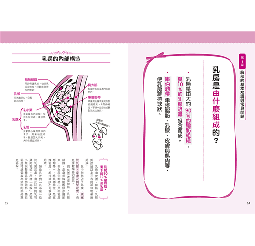 第1章 胸部的基本知識與常見問題介紹乳房的基本生理構造、關於尺寸顏色等令人在意的外觀問題、運動與日常穿著、內衣的選擇保養等相關問題,以及孕期與哺乳的胸部變化。