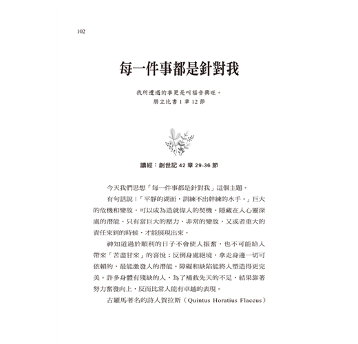 本書是著重神話語的靈修材料,單單渴慕神,誠實地於聖經經文中收取每日的靈糧嗎哪。