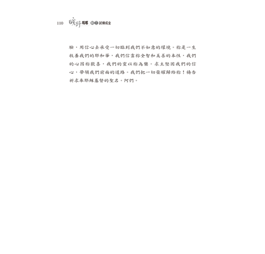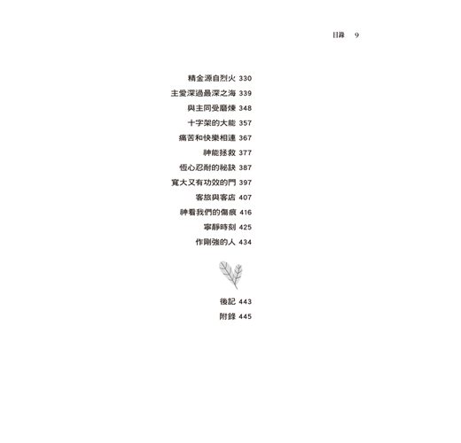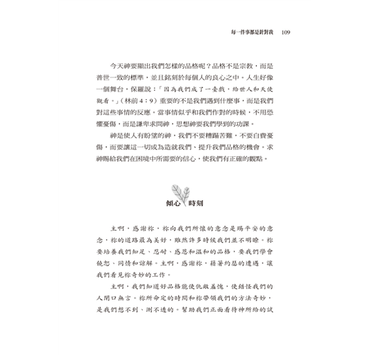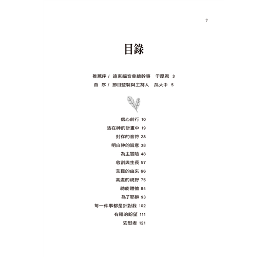 「與主同行」、「突破更新」、「試煉成金」、「謙卑倚靠」、「信心得勝」、「靈性成熟」、「禱告大能」、「忠心服事」。藉著思想、感恩、禱告,領人一步一步認識主,進深人與神之間愛的關係,直到永生。