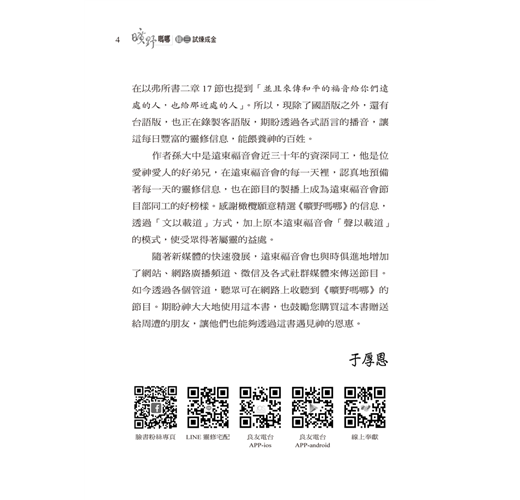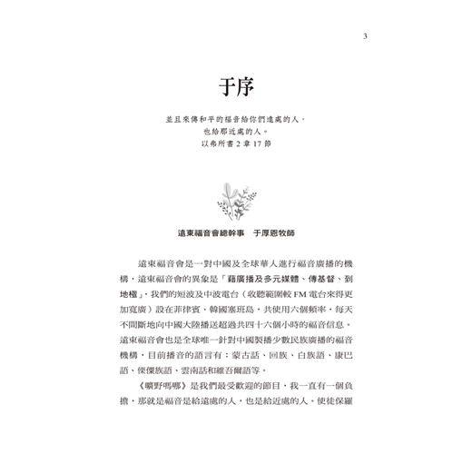 如今《曠野嗎哪》跨越廣播領域,以文字出版。是神按著祂豐盛的恩典成全這一切。感謝陳怡璇姊妹長年以來在文字校稿上的辛勞付出,以及于總幹事並華宣眾同工在促成文字出版上所作的努力。願神繼續使用這些屬天靈糧,安慰、陪伴感到自己如同置身曠野的朋友。