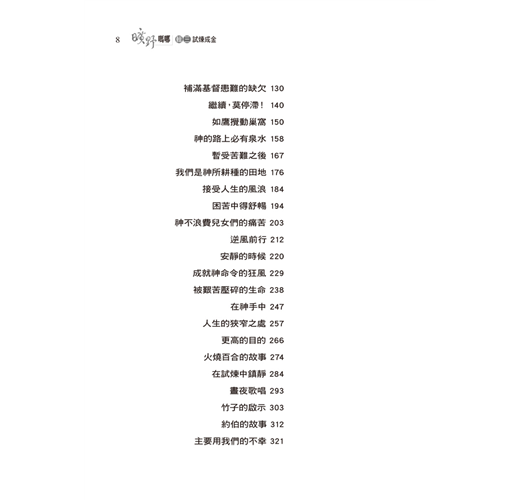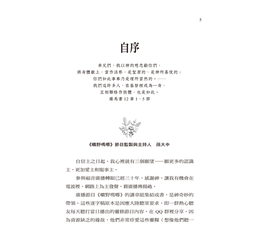 廣播節目《曠野嗎哪》的講章能集結成書是神奇妙的帶領。這些逐字稿原本是因應大陸聽眾要求──一群熱心聽友每天聽打當日播出的靈修節目內容,在 QQ 群裡分享。因為資源缺乏的緣故,他們非常珍愛這些靈糧(想像他們聽一下,暫停,打一句,沒聽清楚再倒回去重聽的辛苦)。可惜因為聽打的關係,難免有疏誤之處,但這卻促使我們嘗試把每天的講章全文上載於良友電台的網站 ,並應不同群組的需求,定期分享。