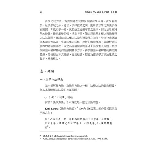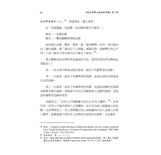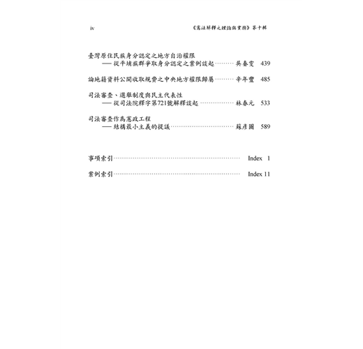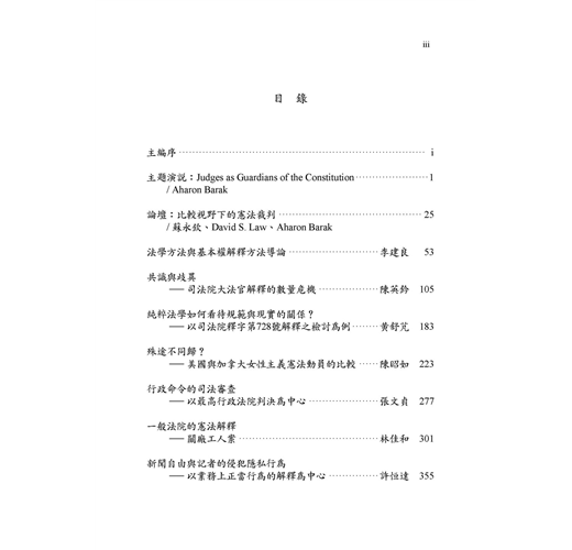 本書收錄前以色列最高法院院長Aharon Barak訪台時所發表之主題演說,以及由Barak院長、前大法官蘇永欽教授、香港大學David S. Law教授等3位當代法學名家關於「憲法裁判」之論壇紀實。對談精細深奧、學理底蘊豐足,當能引領讀者深入思辨;本書亦收錄李建良教授、陳英鈐教授、黃舒芃研究員、陳昭如教授、張文貞教授、林佳和副教授、許恒達教授、吳秦雯副教授、辛年豐副教授、林春元副教授、蘇彥圖副研究員等多位學者之學術論著11篇,思考說理縝密、法學論證嚴謹,殊值讀者典藏!