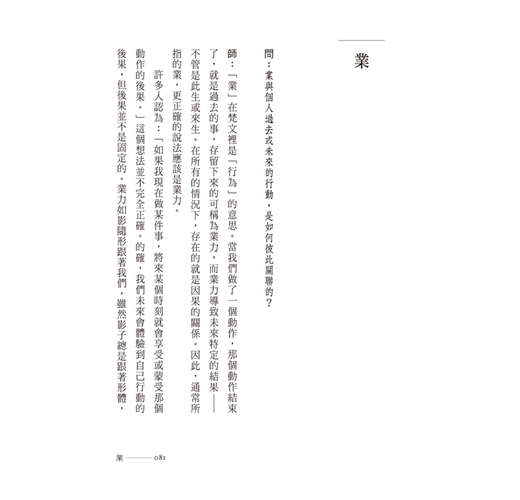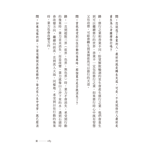 師:不,還是可以那麼說。在受苦之後,業力依然存在,但形式卻已改變。換句話說,業不像一批批好行動、壞行動一樣等著要現前,而是整個的業力。因此,如果體驗到某些壞事,那是以往行為的結果,而業也隨之改變。體驗到好事時,道理也是一樣。