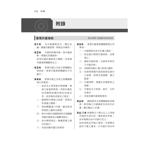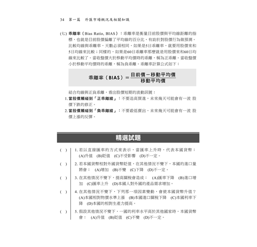 另外,要特別說明的是,「外匯交易專業能力測驗」的合格標準是採用測驗等化方法,也就是以當年度考生整體考試成績作為基準下去計算,也因此你可能會覺得明明聽說很簡單,但仍然有人無法考取,這是因為沒有固定的基準,所以在不確定你的敵人的強弱之前,拉高分數,離合格目標越近!因此本書在每章重點後面,均附有大範圍的「精選試題」,除了有助於了解自己對該章節的了解度外,更有助於了解此測驗的各類命題重點,每多練習一回,越容易上榜!