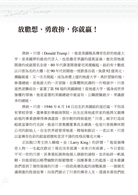 正如脫口秀主持人賴瑞‧金(Larry King)的評價,「他是個傳奇人物,一生起伏跌宕!現在沒有低潮,未來只有高潮」。今日看似不可一世的川普,其事業拓展與他個人發跡的過程,並非始終一帆風順,但他卻能以略帶幽默的堅毅態度,因應事業上的起落。這本書讓