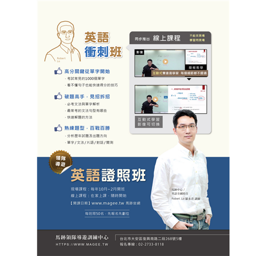 「我想考上執照,我也想要帶團」,馬跡以實務帶入考照,用淺顯易懂的方式進入考照的世界,配合編撰的專業教材,輕鬆學習並培養專業知識,不必再痛苦死背,駕輕就熟。