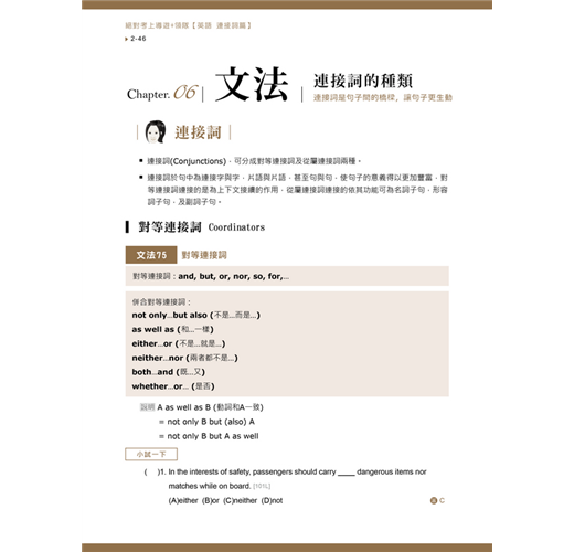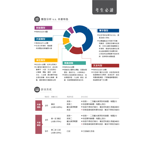 文法的規則,目的在快速拆解句子,破解題型,使考生有更充裕的時間作答。本書整理領隊、導遊最常考「90種文法規則」,即使遇到看不懂的單字,也能運用文法規則,輕鬆破題!
