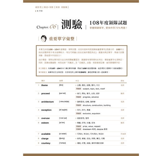 領隊、導遊考試無聽力測驗,作答時只要能看懂單字的意思,進而讀懂句子,即可快速判斷答案。為強化考生在單字的紮實度,解決單字總是背不起來的問題,本書首創「用耳朵快速記單字」,搭配單字語音導讀,透過老師的發音、拼字,讓考生也能開口一起唸,短時間就能記住大量字彙,無論走路、坐車、運動,隨時都能學習。