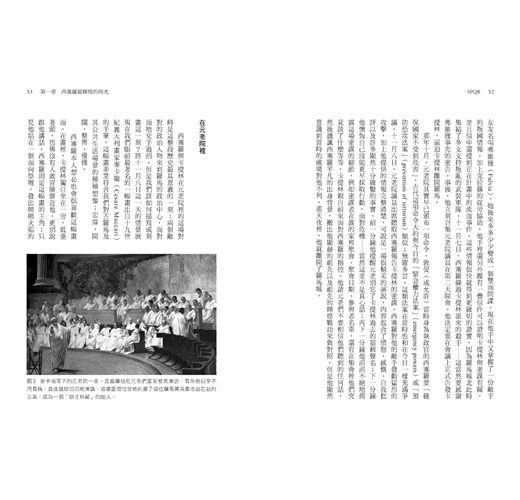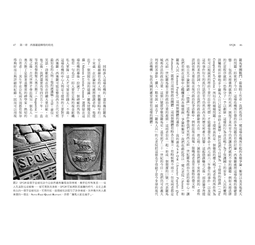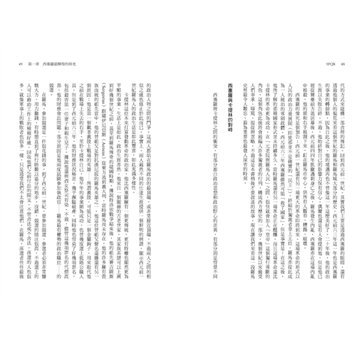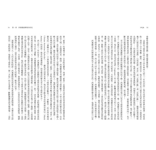 姑且先不論對與錯,「陰謀」這起事件帶我們來到西元前一世紀羅馬政治生活的最中心,讓我們看到在這個中心醞釀著的各種慣例、爭論和衝突。我們也藉此得以一窺元老院(Senate)和羅馬人民(Roman People)這兩個團體的運作─我的部分書名SPQR(Senatus Populus Que Romanus)就源自這兩個政治團體。這兩個團體有時各自獨立,有時候勢不兩立,但是兩者都是西元前一世紀羅馬最主要的政治力量的源頭。這兩者加在一起,形成一個簡潔的口號,代表羅馬城邦合法的政治力量。這個口號貫穿整部羅馬史,甚至到了二十一世紀的今日,我們仍可在義大利看到其身影。擴大一點來說,減去了「羅馬人民」的元老院把這個名字借給了當今全球的現代立法機構,包括美國到盧安達皆有這樣的團體。同時涉入這場危機的,還有幾位羅馬史上最赫赫有名的人物。凱撒當時年約三十來歲,在討論如何處理陰謀者時,他提出了一個別開生面的建議。羅馬財閥克拉蘇(Marcus Licinius Crassus)選擇留在這場危機的幕後,扮演了一個神祕的角色;他有一句名言,即人要有足夠的現金組織私人軍隊,這人才可算是有錢人。不過,這場危機的中心人物是卡提林的主要對手西塞羅。西塞羅可能是整段西方古代史裡最知名的人物;他的演講稿、文章、書信、笑話、詩歌到現在仍在持續大量印刷。在他之後,我們還要再等四百五十年,一直等到基督教聖人奧古斯丁(Augustine)出現之後,古代世界才會出現另一個名人。奧古斯丁是個著述豐富的神學家,熱切的自省者─其生平在公私兩方面都有保存得夠好而且夠詳細的紀錄,因而可以用現代的方式來建構一部合理的傳記。回到西元前一世紀。其實我們主要是透過西塞羅的眼睛,還有透過他個人的偏見來看這個世紀的羅馬和羅馬城大部分的歷史。西元前六三年這一年也是西塞羅的事業的轉捩點,因為自此之後,他的境遇再也不曾像這一年這麼美好了。二十年後,他的政治生涯以失敗告終。不過,他始終對自己的影響力保有信心,偶爾也還是有人會提到他,但是他已經從舞臺前方退居幕後。西元前四四年凱撒遇刺身亡之後,羅馬發生內亂,西塞羅亦在這場內亂中被殺。他的頭和右手被割下來,釘在羅馬市中心,供所有人觀看、糟蹋、破壞。