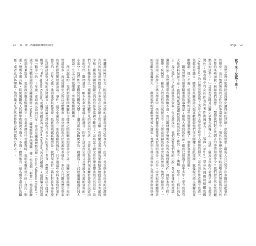 這「公民計畫」使得畢爾德對芸芸眾生如何到達羅馬城、「變成羅馬人」更有興趣,在許多地方也以由下而上(bottom-up)的庶民觀點來看待羅馬這神奇城市。畢爾德的SPQR不是一本以羅馬為中心、政治史敘述為架構的羅馬史,而是所有羅馬人與那些成為羅馬人的故事。我覺得從這觀點來理解SPQR應該最容易把握重點。