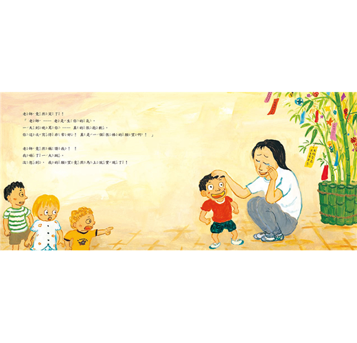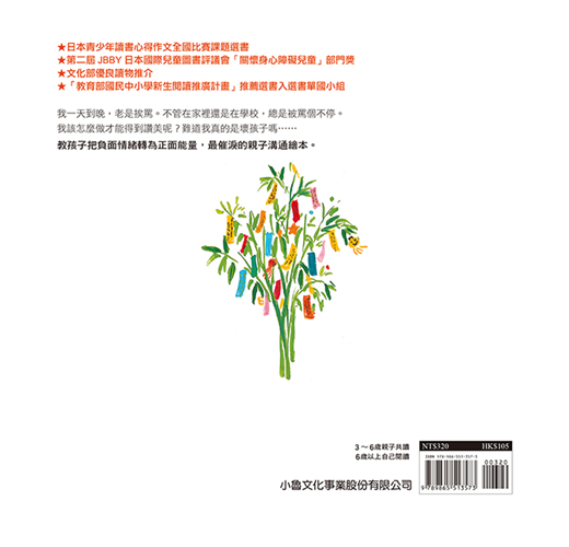 故事裡愛調皮搗蛋的小男孩,雖然心裡這麼想,卻寧願悶在心裡,沒有開口跟媽媽、老師或是朋友們解釋清楚。他所採取的行動是,在七夕許願節的彩色紙條上,一筆一畫,拚了命的認真寫下:「我的願望:天天不挨罵」。對這個孩子而言,這些隻字片語可是他發自內心的心聲,向天神發願的虔誠祈禱。