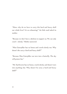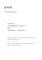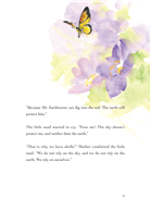 We Rely on Ourselves “Mom, why do we have to carry this hard and heavy shell our whole lives? It’s so exhausting!” the little snail asked its mother. “Because we don’t have a skeleton to support us. We can only crawl—slowly,” Mother answered. “Miss Caterpillar has no bones and crawls slowly too. Why doesn’t she carry a hard and heavy shell?” “Because Miss Caterpillar can turn into a butterfly. The sky will protect her.” “Mr. Earthworm has no bones, crawls slowly, and doesn’t turn into anything else. Why doesn’t he carry a hard and heavy shell?” “Because Mr. Earthworm can dig into the soil. The earth will protect him.” The little snail started to cry. “Poor me! The sky doesn’t protect me, and neither does the earth.” “That is why we have shells!” Mother comforted the little snail. “We do not rely on the sky, and we do not rely on the earth. We rely on ourselves.”