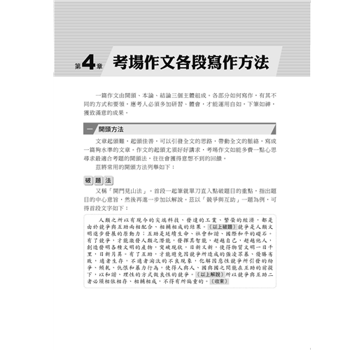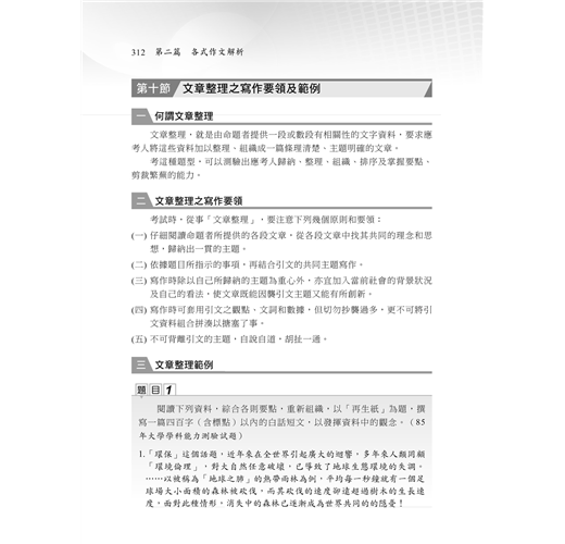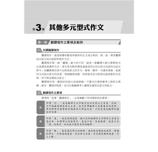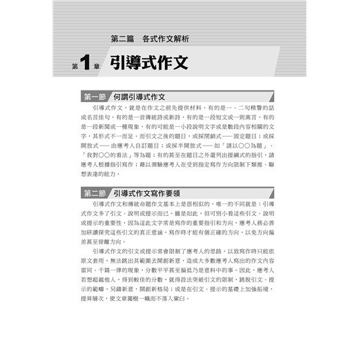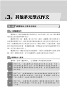 (六)本書〈第1章 引導式作文〉、〈第2章 傳統式作文〉及〈第3章 其他多元型式作文〉中的14種型式作文,涵蓋了命題研究小組所研發的多元型式作文,應考讀者爾後除引導式作文外,對其餘的14種作文型式亦應加強研習。