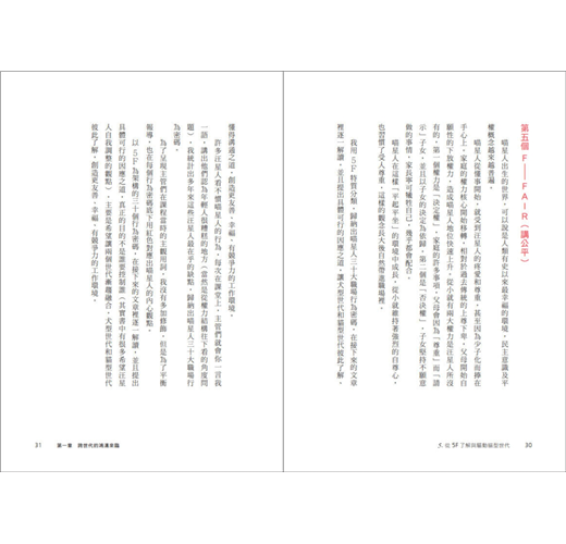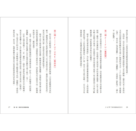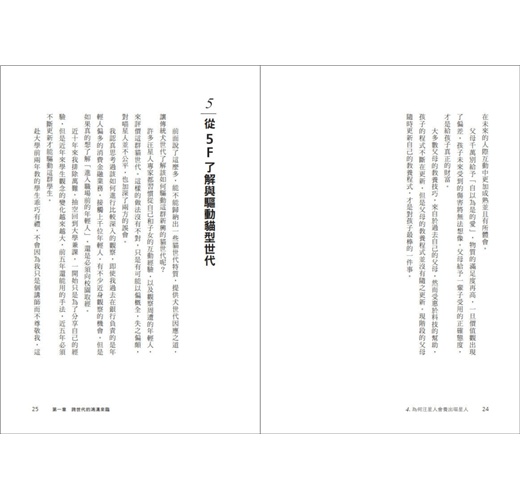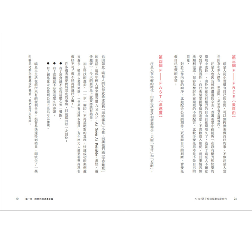 【前言】挾著數位力量,喵星人世代不可同日而語 第一章 跨世代的鴻溝來臨 1. 新舊世代的差距:貓型和犬型為何不對盤 2. 貓型與犬型世代的定義 3. 兩個世代的形成背景 4. 為何汪星人會養出喵星人 5. 從5F了解與驅動貓型世代 第二章 重感覺(FU)──職場氣氛好壞,攸關繼續工作的動力 1. 做自己--><--我是我,沒有人可以要我改 2. 自我感覺良好--><--我只是爭取權利,大人哪懂啊 3. 缺乏同理心--><--總要先顧好自己,才能幫別人吧 4. 缺乏抗壓性--><--不是不能抗壓,而是有沒有必要 5. 事情做完,不會做好--><--我在意工作CP值 6. 缺乏解決問題的能力--><--你沒跟我說怎麼解決啊 第三章 重未來(FUTURE)──築夢於未來,在無所適從中找出口 1. 企圖心不足--><--我不喜歡不知道為何而戰 2. 好高騖遠--><--我尋找發光發熱的舞台 3. 忠誠度不足--><--我忠於「擇我所愛」 4. 不願先付出--><--沒確定是我要的,怎麼先付出 5. 學習意願不足--><--這個那麽簡單幹麼學 6. 不知道自己要什麼--><--我的選項太多 第四章 愛自由(FREE)──突破成規,在彈性自主中達成目標 1. 沒有責任感--><--分內的事情,我一定做好 2. 缺乏時間觀念--><--我有自己的時間表,別催我 3. 下班不待命--><--下了班就是我的時間 4. 做事沒效率--><--我做喜歡的事超有效率 5. 推卸責任--><--責任沒先講 清楚,為什麼只怪我 6. 不主動回報進度--><--時間還沒到,為什麼要回報 第五章 求速度(FAST)──科技加持,講求速成的結果與答案 1. 容易放棄--><--我只是不想做沒興趣的事情 2. 沒耐心苦熬--><--我追求快狠準達標 3. 特別期待肯定--><--有努力,當然應該被看見 4. 喜歡抄捷徑--><--用更快的方法完成不對嗎 5. 安於現狀--><--我要的你又不懂,小確幸只是調劑 6. 一心多用--><--用網路勝過走馬路 第六章 講公平(FAIR)──期待受重視,與人平起平坐 1. 沒禮貌又白目--><--我只是真性情,做人何必虛偽 2. 不配合團隊--><--一樣在工作,為何別人不配合我 3. 聽不進別人建議--><--我做的很好啊,為什麼要改 4. 不願做小事--><--我又不是來應徵做小事 5. 死不認錯--><--錯的未必是我,而且不能好好講嗎 6. 不知感恩--><--不是該互相幫忙?我感恩只是沒講 【結語】長大後的態度,就是小時候的教養