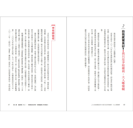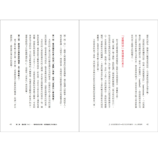 2. 運用情境式個案說明: 本書每個章節均以一個案例當開頭,具體說明當前許多主管最常碰到的新世代管理難題,再幫助主管重新檢視自己和新世代年輕人溝通時跨不過去的心結或過時的方式,學習高效溝通的心法,與部屬建立信任關係,凝聚共識,進而提升團隊的即戰力。