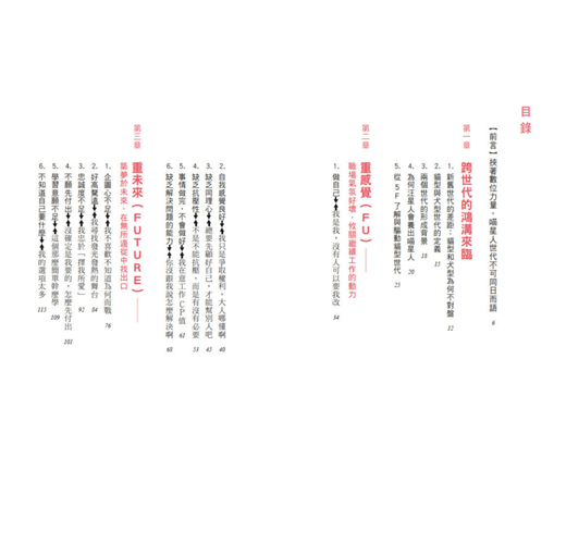 【前言】挾著數位力量,喵星人世代不可同日而語 第一章 跨世代的鴻溝來臨 1. 新舊世代的差距:貓型和犬型為何不對盤 2. 貓型與犬型世代的定義 3. 兩個世代的形成背景 4. 為何汪星人會養出喵星人 5. 從5F了解與驅動貓型世代 第二章 重感覺(FU)──職場氣氛好壞,攸關繼續工作的動力 1. 做自己--><--我是我,沒有人可以要我改 2. 自我感覺良好--><--我只是爭取權利,大人哪懂啊 3. 缺乏同理心--><--總要先顧好自己,才能幫別人吧 4. 缺乏抗壓性--><--不是不能抗壓,而是有沒有必要 5. 事情做完,不會做好--><--我在意工...