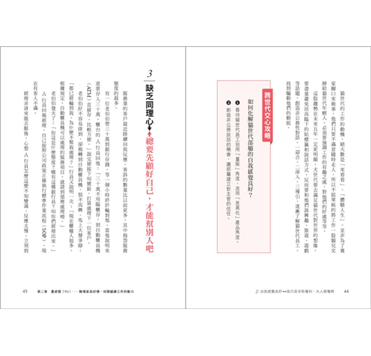 3. 三十大喵世代行為密碼解析後附有「跨世代交心攻略」: 解析完新世代行為密碼,並提供因應方法之後,再整理出重點攻略,除了加深印象之外,也可以做為日後在管理上的重點提醒。