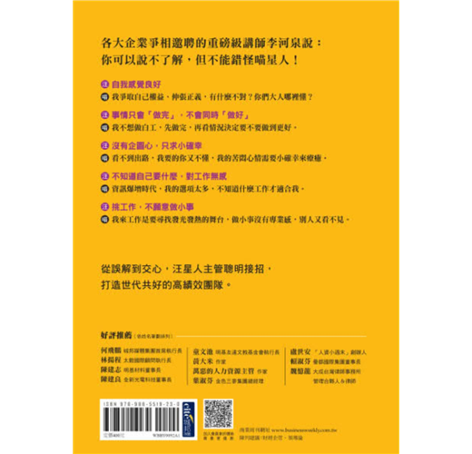李河泉說:「你可以說不了解,但不能錯怪喵星人!」喵星人一定會逐漸成為職場主力!與其看不慣年輕世代的工作行徑與價值觀,汪星人主管不如識時務,擺平「媳婦熬成婆」心理,聰明接招,打造世代共好的高績效團隊。