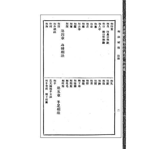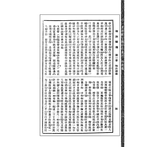 本書將傳統相術的四大名著:《麻衣相法》、《柳莊相法》、《神相鐡關刀》、《水鏡集》,「選擇四大名著之精華,冶為一爐,正其刊誤,聊供世之同好者之借鑒」。書中分十二章:相法總論、相術歌訣、面部相法、身體相法、手足相法、形神氣色骨肉相法、坐臥行動言語相法、痣紋相法、改相變相相法、女子相法、小兒相法、古人觀相精論。