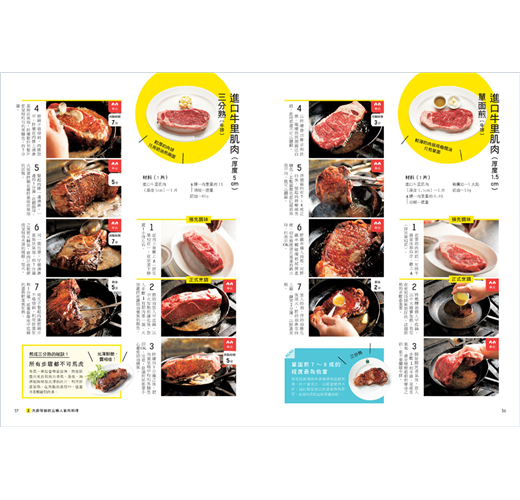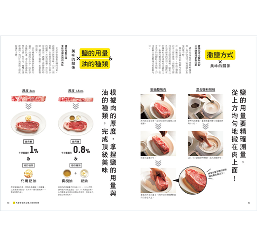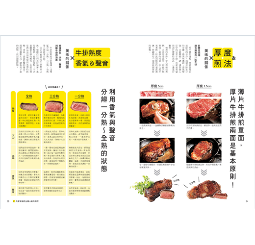 全書用大圖搭配文字講解,教你選肉時看肉的色澤、形狀與肌理;烹煮時觀察肉的顏色變化、聲音與氣味。不但讓你看圖就能分辨「熟度」與「焦度」,還專為初學者列出精確數據,例如加熱7分鐘、翻面4次、利用餘溫加熱20秒後起鍋……等等,即使第一次下廚也能跟做成功。