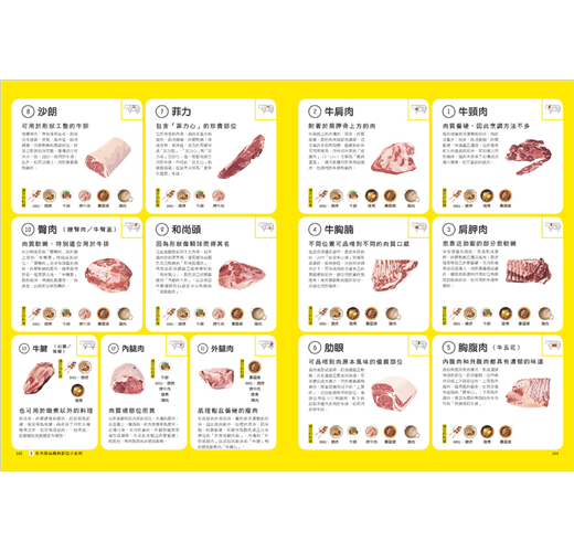五花、里肌、腰內肉有什麼不同?日本和牛為什麼特別好吃?透過圖表和照片解析雞豬牛羊的肉質特色,針對不同肉類特性、不同部位提出最適合的烹調方式
