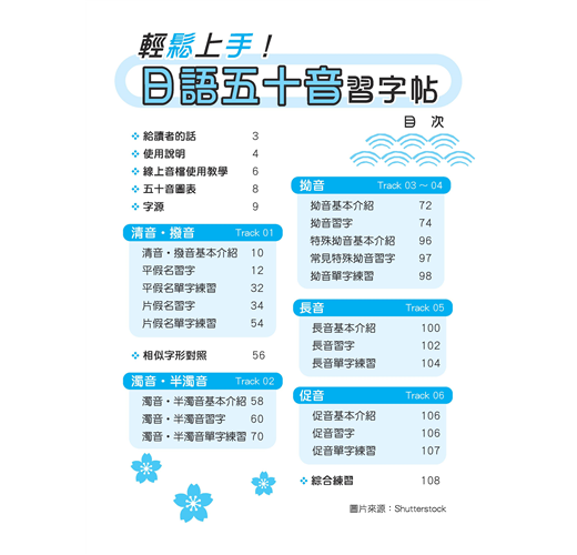 本書依照發音特性分為「清音‧撥音」、「濁音‧半濁音」、「拗音」、「長音」、「促音」五大章節。內容編排循序漸進,從發音介紹、字形解析、習字帖至單字練習,逐步奠定初學者的書寫基礎。