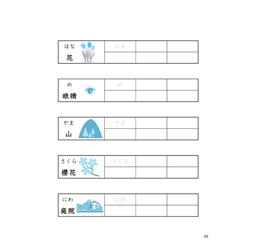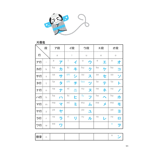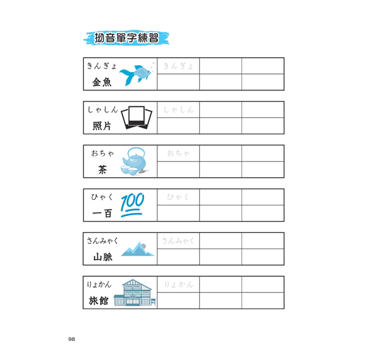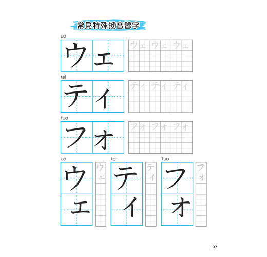 五十音的運筆練習設計為,左頁詳細解析字形的運筆技巧,搭配右頁習字帖實際練習。衍生音的習字帖則為左右頁對照練習平假名與片假名,加深字形記憶。
