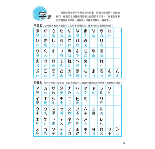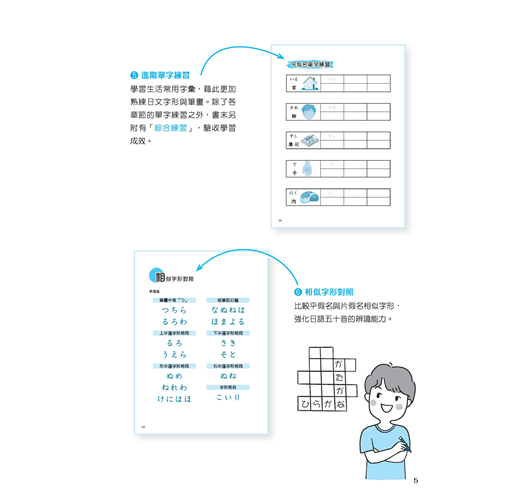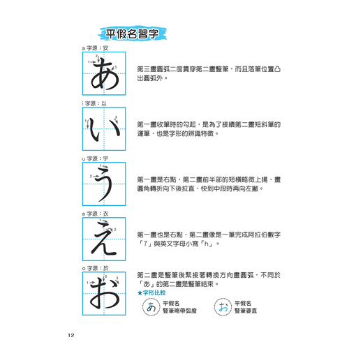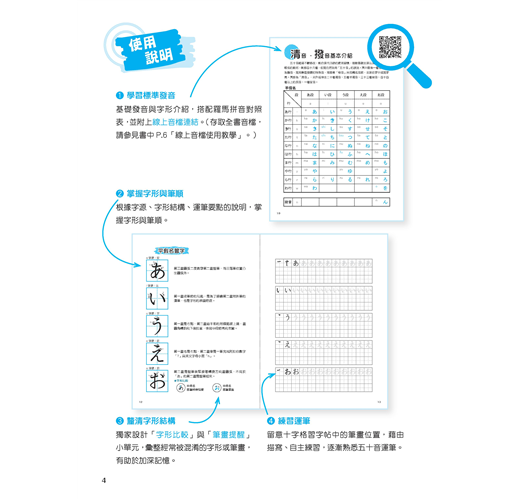 詳細解說平假名、片假名運筆要點,輔以筆順標示、字源介紹,並將經常被混淆的字形整理為「字形比較」與「筆畫提醒」單元。初學者按照內容練習運筆,即可輕鬆寫出五十音。