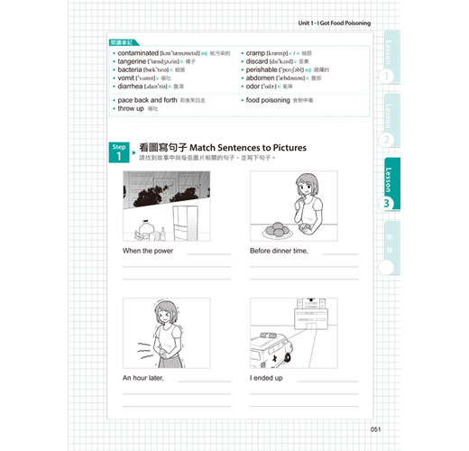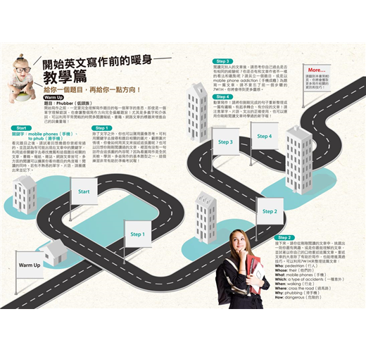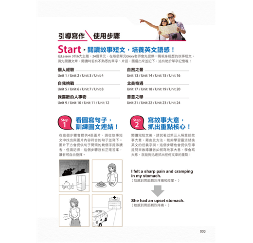 看圖寫作已經是全民英檢初級複試、多益寫作測驗、學測英文作文的基本題型之一!此單元藉由提供4張圖片,讓讀者從故事範文中找出並寫下符合圖片內容的句子。透過圖文連結,除了強化文字理解力之外,同時也可訓練圖像的邏輯思考及英文句型練習,讓左右腦同步運作、均衡發展,使英文寫作不再枯燥乏味!