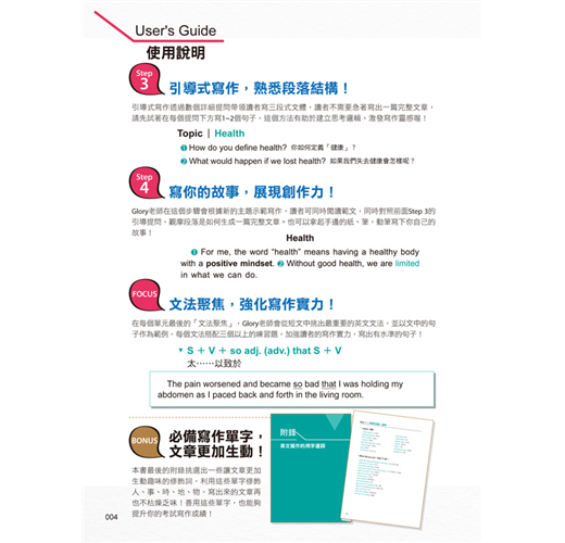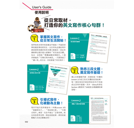 本書的「看圖寫句子」單元設計,是利用4張圖讓讀者學習抓出段落大意和重點句型,從圖文配合中訓練文意理解力!除了使英文寫作不再枯燥乏味,還可激發大腦的創意思考力。