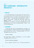 為了讓讀者不致覺得本書理論性過強,在每個章節的「3分鐘英文」專欄中,作者依詞性彙整了260組常見易混淆字詞,提供精闢的分析與說明,相信對讀者而言,這應是在嚴肅研習過程中的一種調劑。另外,雖然本書的目的在於幫助讀者「理解」英文文法,但畢竟內容仍屬「紙上談兵」,而以中文為母語的人士在「實戰」上總是會「不由自主」地受到母語的影響,因此,在本書的末尾,也特別附加了「這樣說O不OK?」的篇章。此部分共列出100個典型的中式英文單句,文中除了說明各單句的錯誤,也提供正確的說 / 寫法,希望能對研讀本書者有加乘的助益。