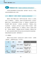 ◎第四章 韓語句法構造句法構造,也就是詞彙組成句子的規則。本章節主要針對韓語句子內的成分關係、排列順序、組合方式、以及成分添加的各種方式做說明,透過理解句子組成的基本規則,還有詞彙在句子當中的功能,以及每個詞彙在當中所扮演的角色,能確實了解句意。