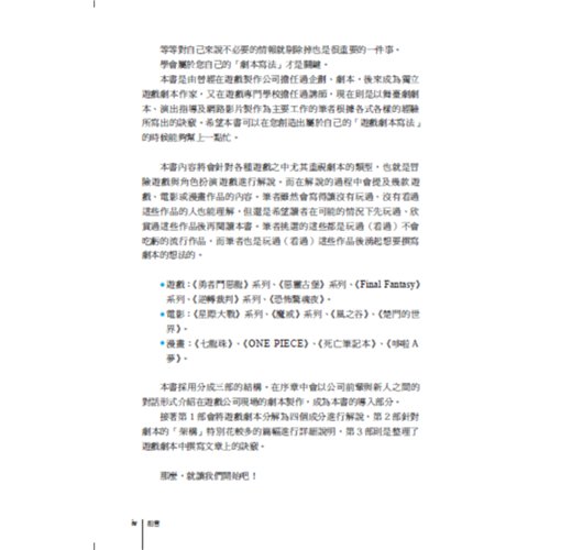 是獨立工作室或目標成為遊戲劇本家入門時不可或缺的工具書。