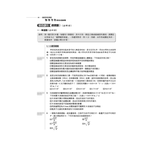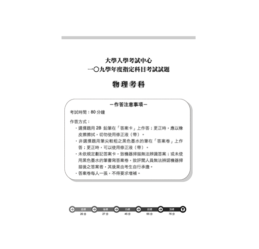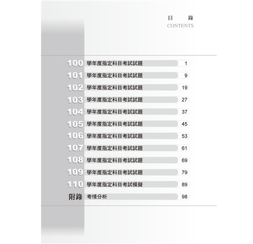 本書內容編排方式依照大學入學考試中心所公布的題本,且答案欄的設計也是採用大考中心的填答畫記方式,讓同學們立即進入仿真情境。對於即將上考場的同學們而言,「知己知彼,才能百戰百勝」,熟練歷屆試題,真實模擬演練,絕對是有加分的效果。