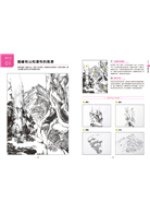 ▲不只黑白,更要色彩本章節由作者帶領你畫出「由大樹構成的城鎮」以及「位於瀑布上方的城鎮」,從決定構圖開始,每一個步驟、細節和要點都不馬虎,如同完成一幅正規作品該有的順序一樣,每一個階段都詳細說明,另外附有白詰千佳老師的上色教學,教你如何掃描黑白稿,利用Adobe Photoshop著色,如此一來不管是黑白還是彩色,都能讓你隨心所欲想畫就畫了!